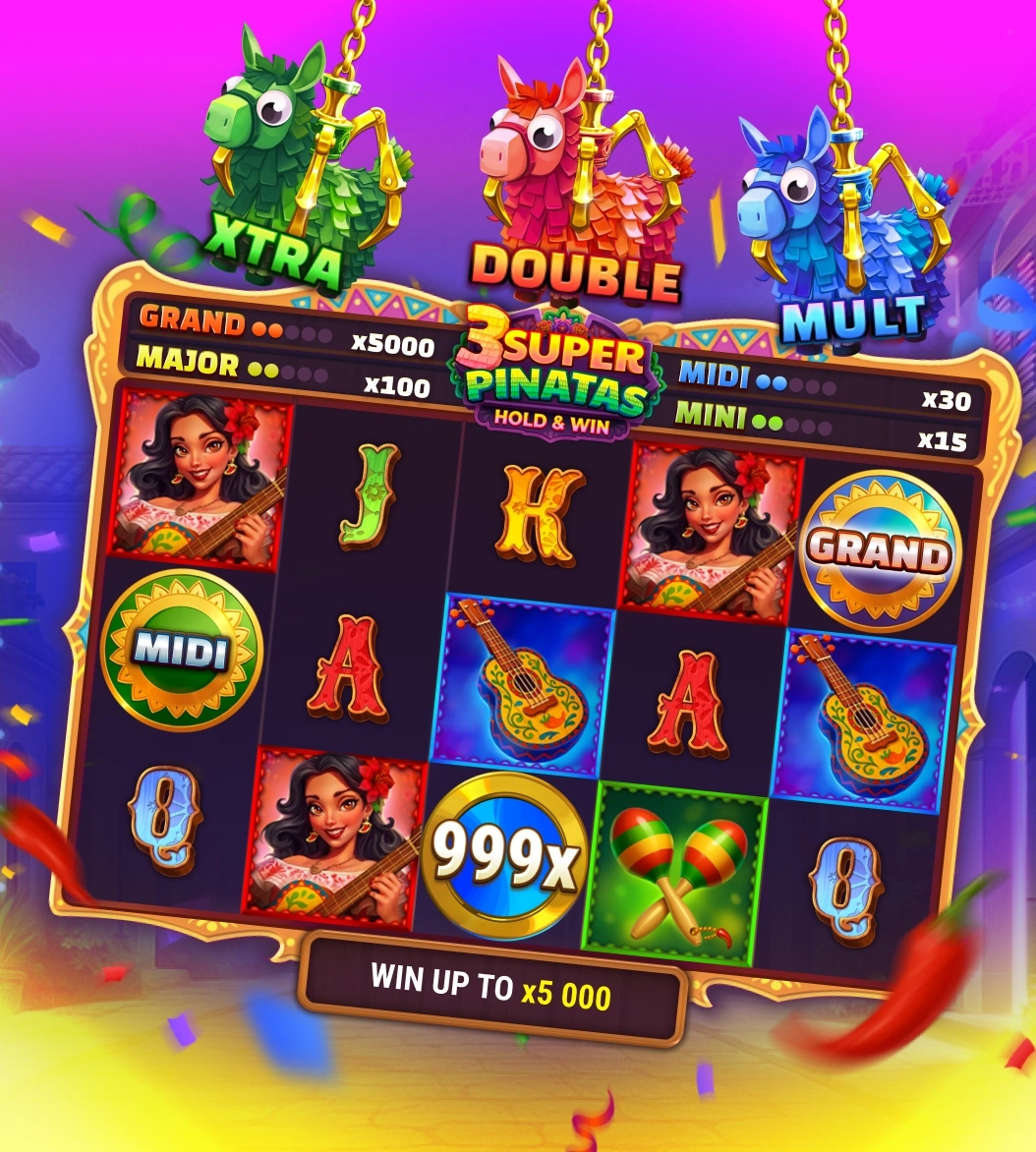 3 Super Pinatas combines the proven thrill of Hold & Win gameplay with the sizzling spice of Xtra, Double & Mult Pots, where every spin can ignite jackpots and fiesta-sized wins.